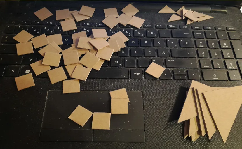 Von etwa 1:10 bis 2:30 sehen wir hier die grundlegende Konstruktion des Stecksystems für die Kacheln. Wichtig ist, zum Zusammenkleben Holzleim zu verwenden (und nicht Heißkleber oder Superkleber udgl.), wegen der Höhe des Steckschlitzes / Dicke der Verbindungsplatterln!Dazu hier ein Bild von unseren: