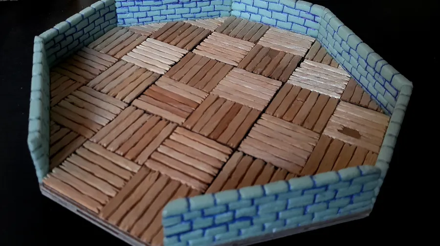 * Jedes Brett wird einzeln zugeschnitten auf eine Länge von ca. 31mm, und da sie etwa 5mm breit sind bekommt man bequem 6 von ihnen nebeneinander auf ein 32mm Feld (incl. bissi Abstände von 0.5 - 1 mm, für den noch bisschen roheren Look).
