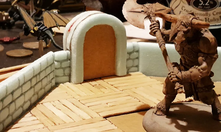 An sich bereits voll funktional, um in einem handelsüblichen Abenteuerverließ (vulgo: Dungeon) halt so Türen darzustellen - man könnte das ganze jetzt einfach am Rand umadum in Grau anmalen und innen die Öffnung braun (oder schwarz) machen, und hätte effektive (wenn auch leicht abstrakte bzw. symbolhafte) Türen... ...aber in Wirklichkeit beginnt jetzt für den passionierten Modellbauer erst der richtige Spaß: nämlich die Textur und Details der Türen selbst!Weil das aber den Post hier zu lang machen würde, schauen wir uns das besser getrennt an. Nächstes Mal zeigen wir euch dafür dann mit aller Liebe zum Detail eine handvoll verschiedener Stile von Türen die wir gemacht haben, alle basierend auf den hier gezeigten Prinzipien, aber mit verschiedener Optik und anderen Techniken realisiert.